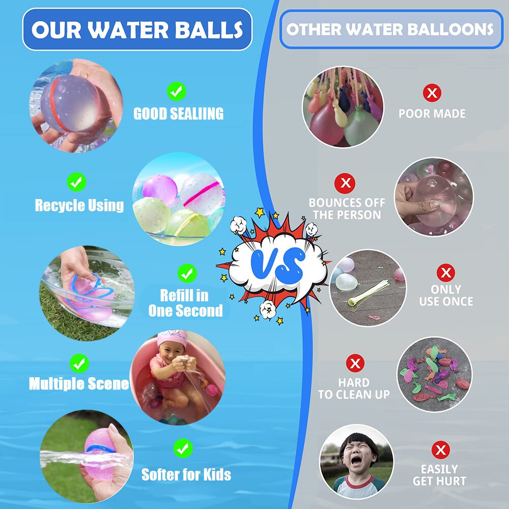 4. Suitable for many occasions: Our self-sealing water balloons are designed to release the fun quickly and easily. These odorless skin friendly water balloons are suitable for kids parties, birthday parties, anniversaries, pool parties and many other outdoor events